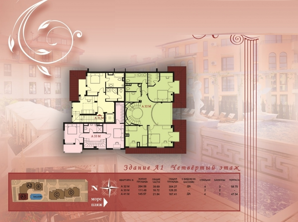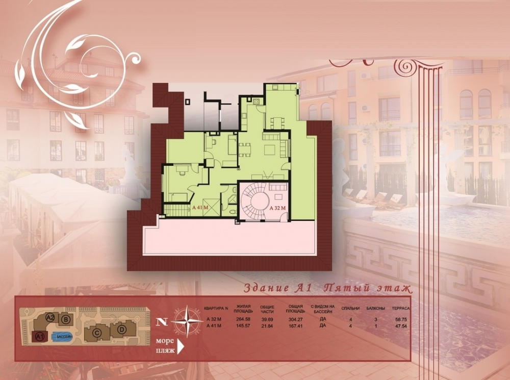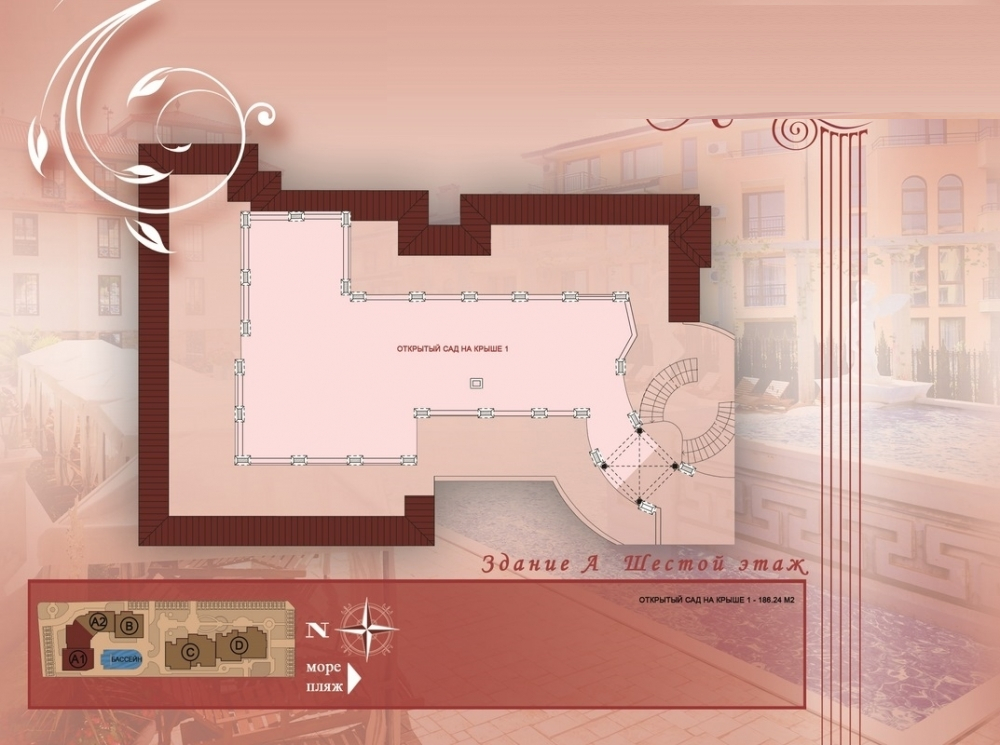 Собствениците на пентхауси използват голям двор, тераса с красива и уникална растителност, пейки и беседки, предлагащи изключителна панорамна гледка на брега на Черно море.